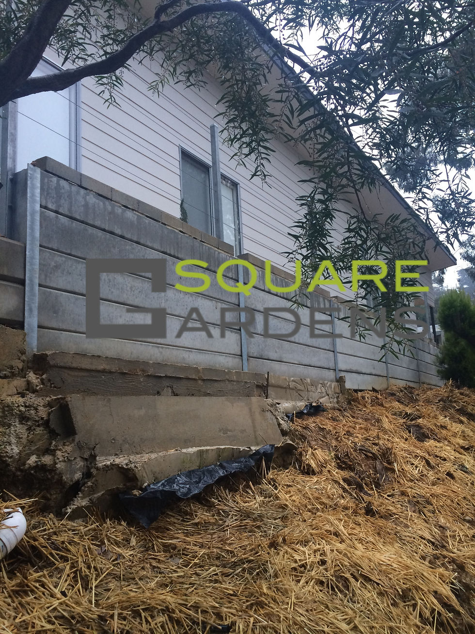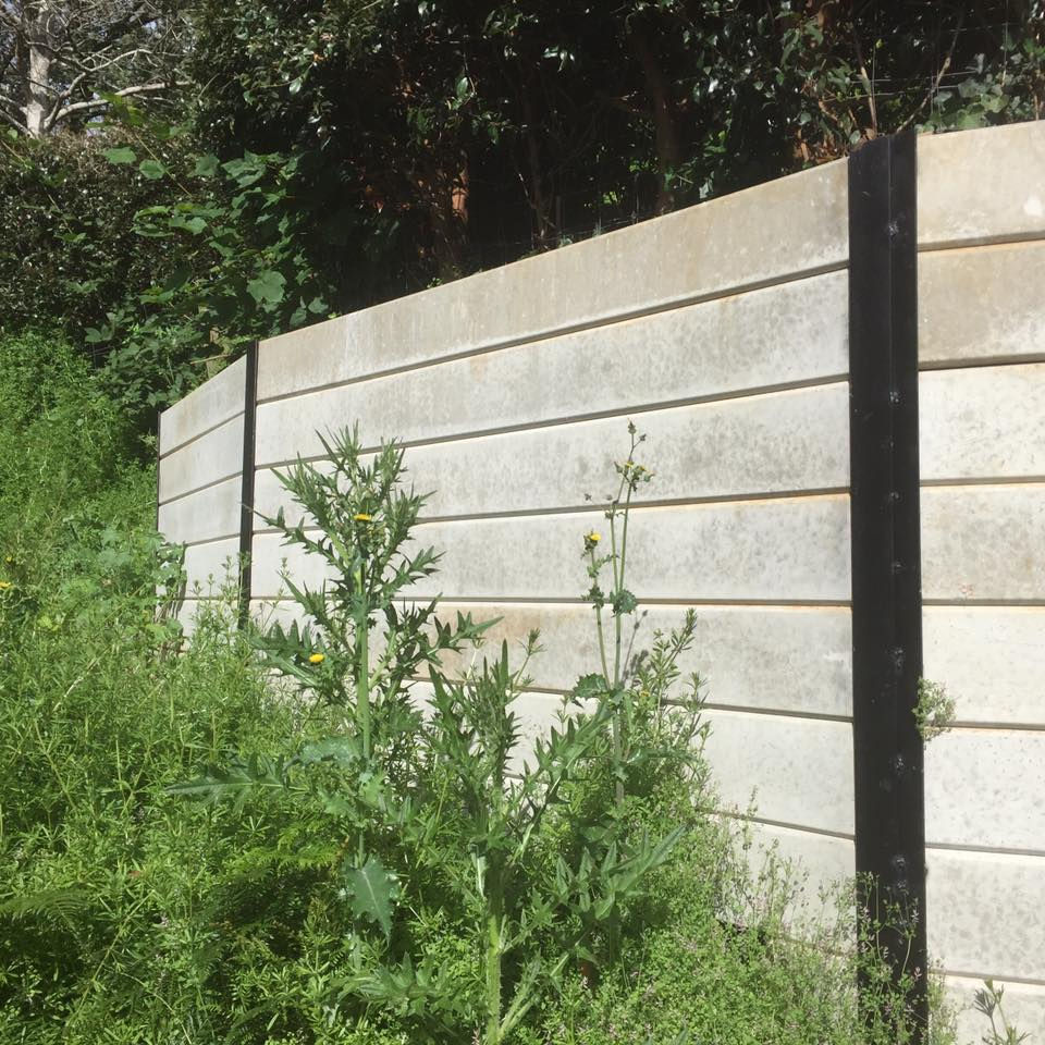 Plain Textured concrete sleepers retaining walls with "good neighbiurs" fence on top, stormwater installation